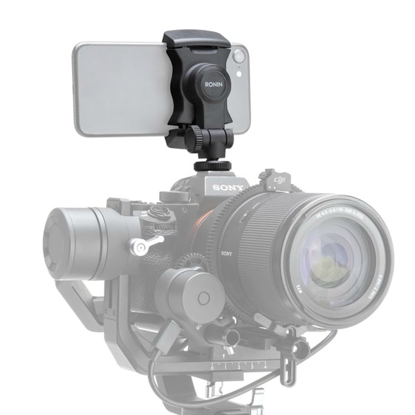 Держатель телефона DJI Ronin-S/SC Phone Holder надежно крепится к держателю камеры, что позволяет использовать ActiveTrack 3.0, и подключается к порту RSA при использовании мобильного устройства в качестве монитора камеры, обеспечивая быстрый доступ к настройке параметров камеры. [1]